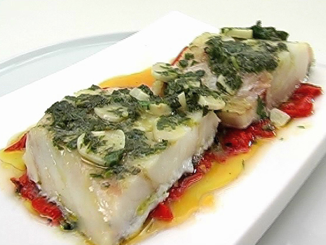Вкуснейшее блюдо из трески.Состав:филе трески — 2 куска;сладкий перец — 2 штуки;белое вино — 1 стакан;чеснок — 1 зубчик;петрушка, оливковое масло, соль — по вкусу.