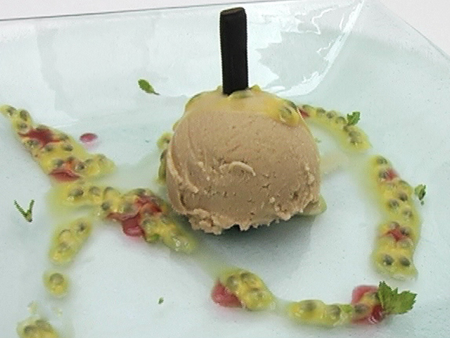 Необычный десерт для знатоков мороженого.Состав:лакрица — 3 палочки;молоко — 400 гр;желтки — 6 штук;вода — 100 гр;сахар — 150 гр;гренадилла — 2 штуки.